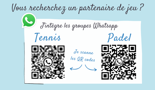 Vous cherchez des joueurs pour compléter votre session de padel ? Rapprochez vous du club, nous vous aiderons à trouver des partenaires de jeu grâce à notre groupe Whatsapp !