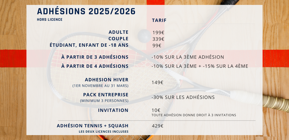 Les squashs sont disponibles à la location ou vous pouvez adhérer si vous le souhaitez.